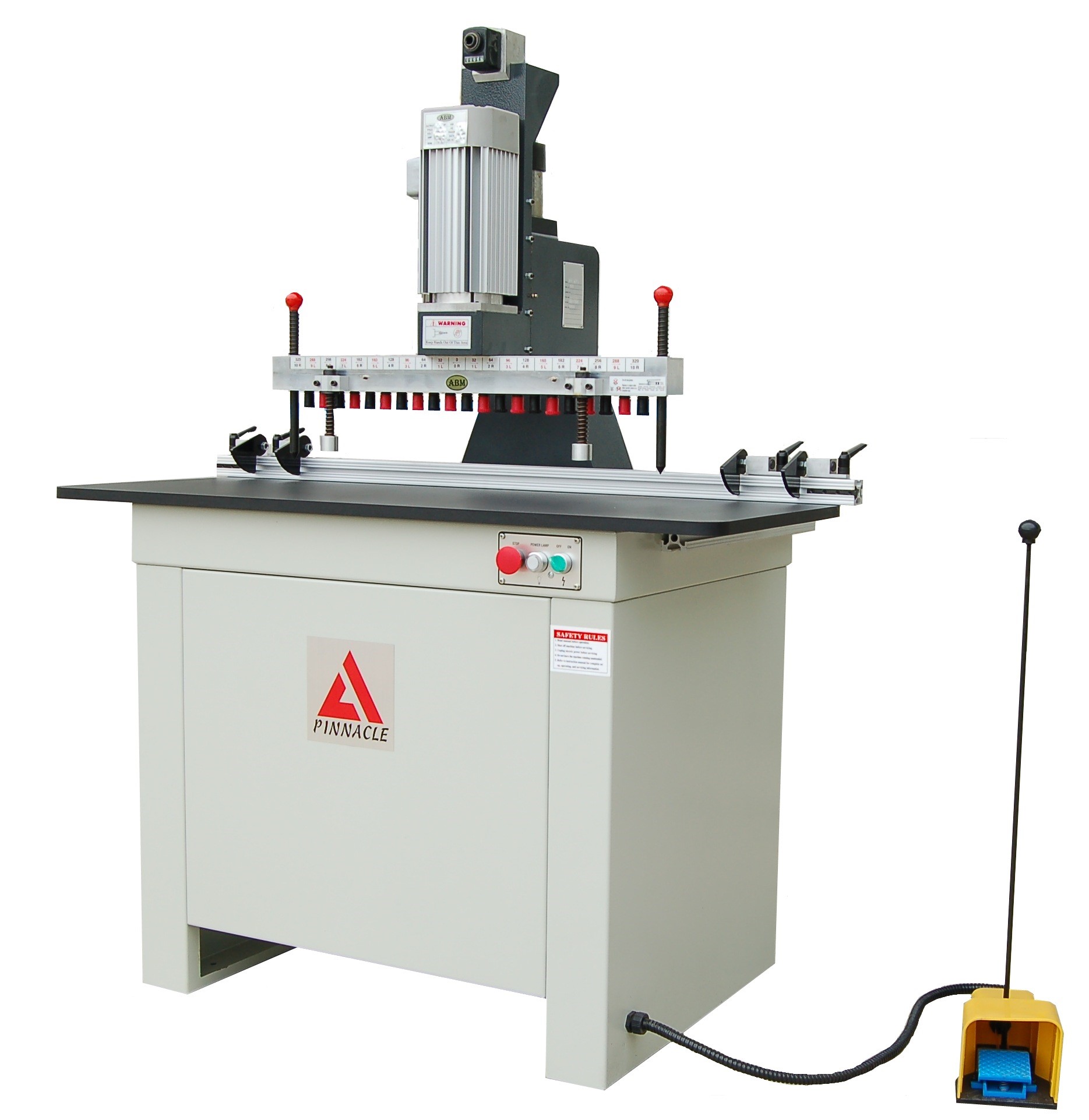 The Pinnacle BM-21V line boring machine has everything needed to do 32mm line boring. It’s ideal for drilling shelf supports, hinges, etc. The BM-21V features a powerful 2.5HP Motor that starts only when the pneumatic feed cycle is activated by the foot pedal, extending the service life and conserving power. Steel gears transmit plenty of power to the spindles at 2450 rpm. The large 20” x 47” table provides plenty of work support and slides on two tracks, keeping the fence parallel to the head at all times. A 60” fence with 4 flip stops locates material with precision. Two manual head mounted index pins provide precise positioning of longer stock.